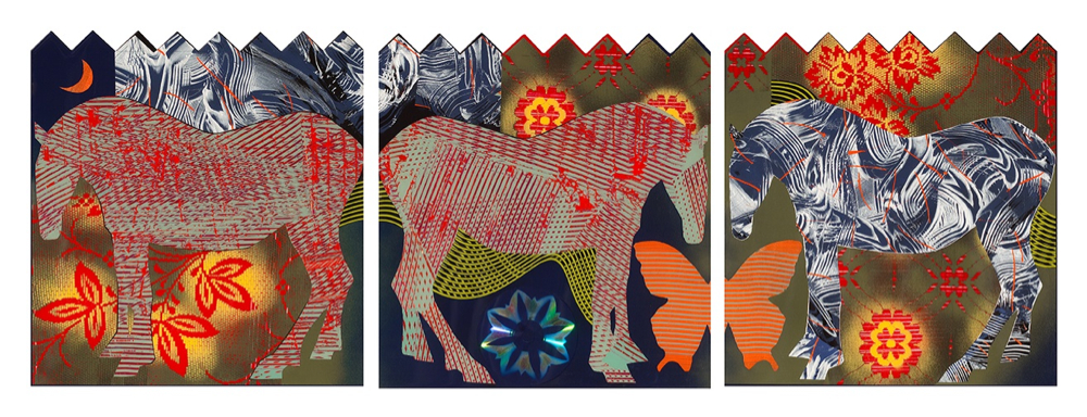 5- Phase croissante, 2011, triptyque,pellicule d'acrylique CD et résine sur bois, 43 x 122 cm (17''x 48'')